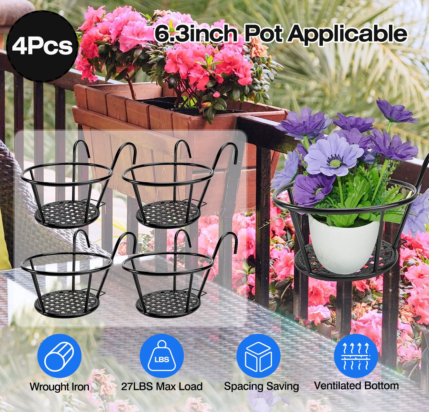 *Space Saving Pot Container Basket*:This railing planter makes full use of vertical space and adds more vigorous to your space. Showcase your lovely potted plants. Multiple bottom holes keep the flower pot well ventilated.
