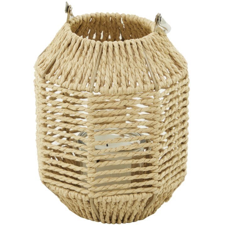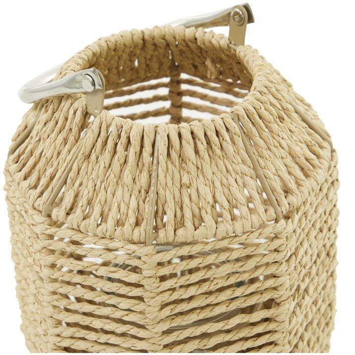 Aesthetically pleasing woven candle lantern is made of paper rope, metal, stainless steel, and glass