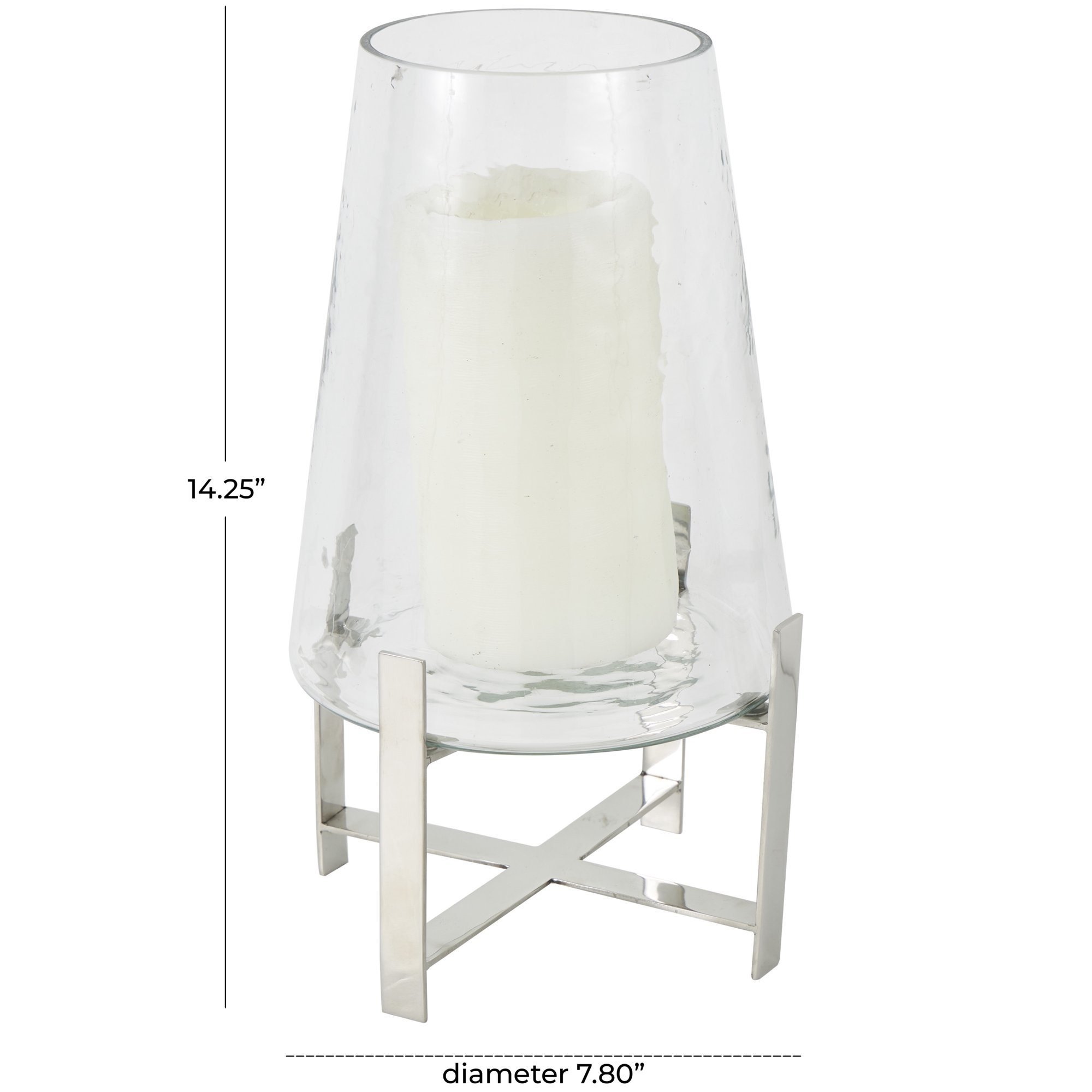 The contemporary round clear glass hurricane lamp features a silver colored X-shaped base, making it an eye-catching addition to any room